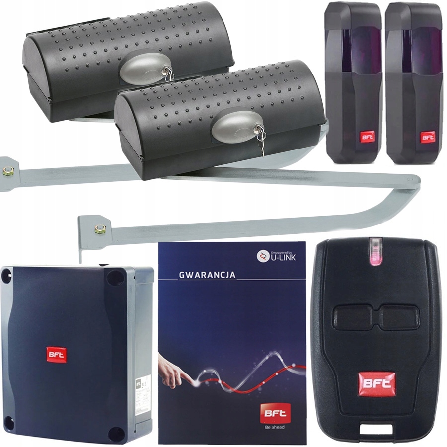 Zestaw BFT IGEA do bramy dwuskrzydłowejZestaw automatyki do bramy dwuskrzydłowej BFT IGEA przeznaczony jest do automatyzacji bram dwuskrzydłowych o maksymalnej długości do 2,5 m i ciężarze do 250 kg każdego ze skrzydeł. Zestaw posiada wbudowane regulowane wyłączniki położeń krańcowych - brak potrzeby stosowania odbojów przykręcanych do podłoża. W skład zestawu wchodzą: