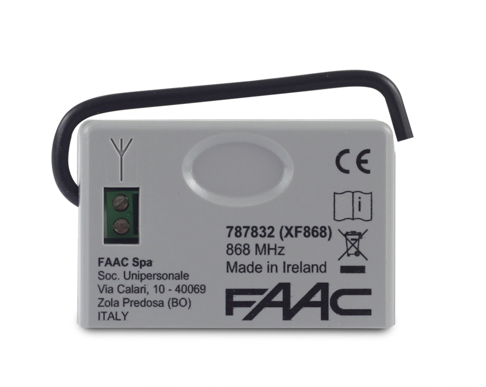 Radioodbiornik XF 868 MHzModuł radioodbiornika FAAC XF868 przeznaczony do napędów FAAC z 3-pinowym złączem komunikacyjnym. W takie złącze wyposażone są min. wszystkie napędy D600, D700, D1000 oraz wszystkie nowe centrale sterujące takie jak E045, E145, E024, E124. Odbiornik nie pasuje do 5-cio pinowych złącz w starszych elektronikach. Moduł radioodbiornika nie jest urządzeniem działającym samodzielnie – w płytach elektroniki przeznaczonych do współpracy z 3-pinowym złączem zamontowany jest dekoder, który współpracuje z modułem