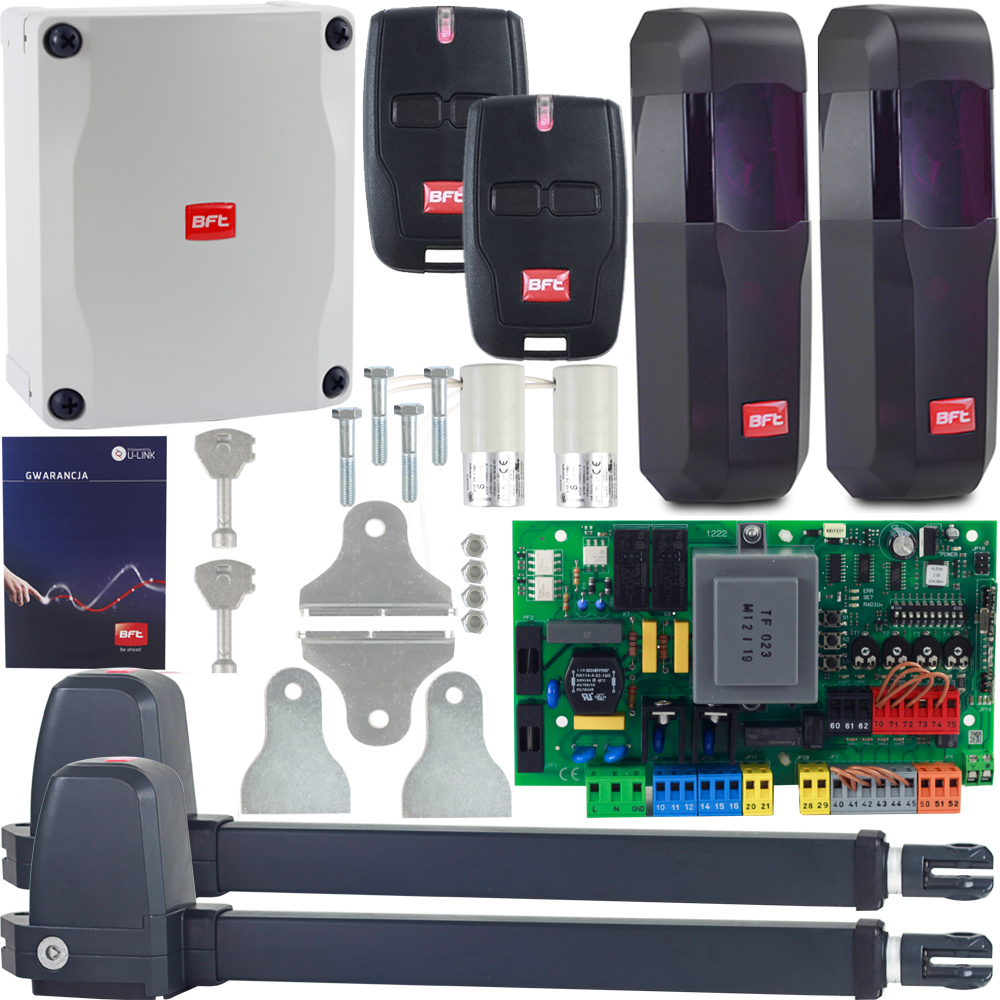 Zestaw BFT Athos AC A25 do bramy dwuskrzydłowejZestaw automatyki do bramy dwuskrzydłowej BFT ATHOS AC A25 przeznaczony jest do automatyzacji bram dwuskrzydłowych o maksymalnej długości 4 m i maksymalnym ciężarze do 700 kg każdego ze skrzydeł. Maksymalna głębokość osadzenia zawiasu (bez uchwytu bramy) - do 8 cm. Siłowniki nie posiadają mechanicznych krańcówek - należy zamontować odboje w podłożu. W skład zestawu wchodzą: