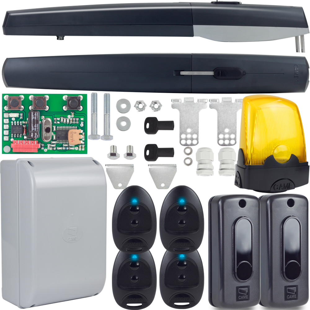 KOMPLETNY ZESTAW CAME AXI A20 SAFEGotowym do samodzielnego montażu zestaw przeznaczonym do bram 2-skrzydłowych do 4 m (długość skrzydła 2 m). KOMPLETNY ZESTAW ZAWIERA: