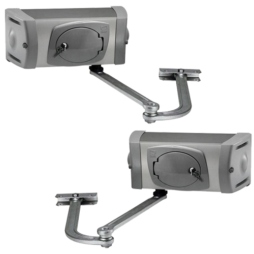 Samoblokujący siłownik 150W z ramieniem łamanym. Czas otwarcia do 90° - 18s. Posiada 2 wbudowane wyłączniki krańcowe. Maksymalna długość jednego skrzydła 4m. Sprawdza się nawet na słupach o dużych wymiarach. Prosty montaż na skrzydłach bramy o szerokości do 4m, gdy brama znajduje się pomiędzy słupami o dużych wymiarach, a prześwit pomiędzy czołem słupa i zawiasem bramy jest dość duży i wynosi nawet 30cm. Solidny i potężny, zaopatrzony w ramię łamane lub proste ramię teleskopowe dostosowujące się do specyficznych wymagań instalacyjnych i wymiarów bramy. Siłownik o dwóch twarzach - "Double Face" Wyłączniki krańcowe działające w oparciu o system “double face” sprawiają, że instalacja i regulacja są jeszcze praktyczniejsze. W zależności od miejsca montażu siłownika (na prawym lub lewym słupie) umożliwia to optymalne ustawienie wyłączników krańcowych. Zalety Bezpieczna praca, regularny i płynny ruch bramy, wszechstronne rozwiązanie z prostym ramieniem napędowym dla zmniejszenia gabarytów w przypadku ograniczonej przestrzeni - obecność murów, ogrodzeń w pobliżu bramy. Całkowita kontrola