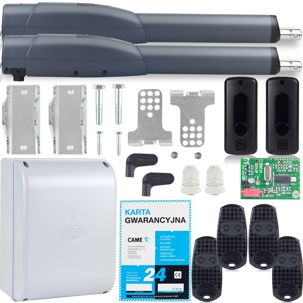 KOMPLETNY ZESTAW CAME ATS30AGS do 3m skrzydła o wadze 400kgGotowym do samodzielnego montażu zestaw przeznaczonym do bram 2-skrzydłowych do 6 m (długość skrzydła 3 m). KOMPLETNY ZESTAW ZAWIERA: